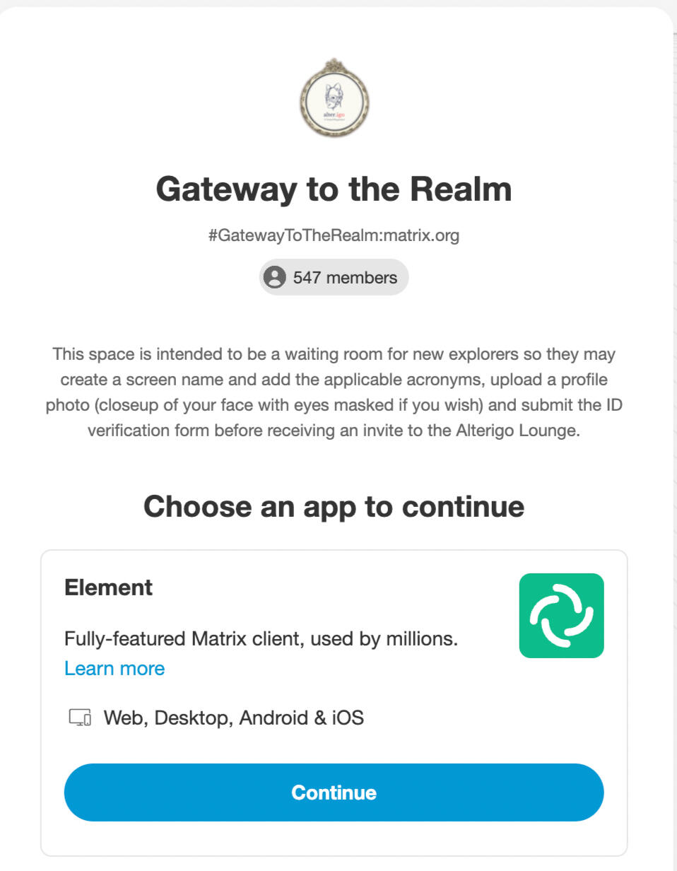 IMPORTANT! You must download and install the Element mobile app (see link below) if you wish to use your phone to join the Realm. Your phone's browser will not work with the Element app. If prompted, on the registration page (for both mobile and web) select "matrix.org" as the home server and "Element" as the Client.For both web and mobile apps you must create an account and set a user name and password. After you log into the app, search for "Gateway to The Realm:matrix.org" or "Realm:matrix.org." Alternatively, you may try searching for "Realm" or "Gateway to the realm" under public rooms.You can also use a desktop browser to go directly to the Element web application by clicking the button below. This will take you directly to Gateway to The Realm.