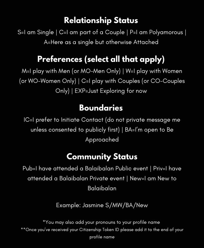 In Gateway to the Realm on Element/Matrix create a profile page, upload a profile photo of your face (you may mask your eyes), add the applicable acronyms (listed in the below image) to your screen name and submit your ID verification form that you may access by clicking on the button below.